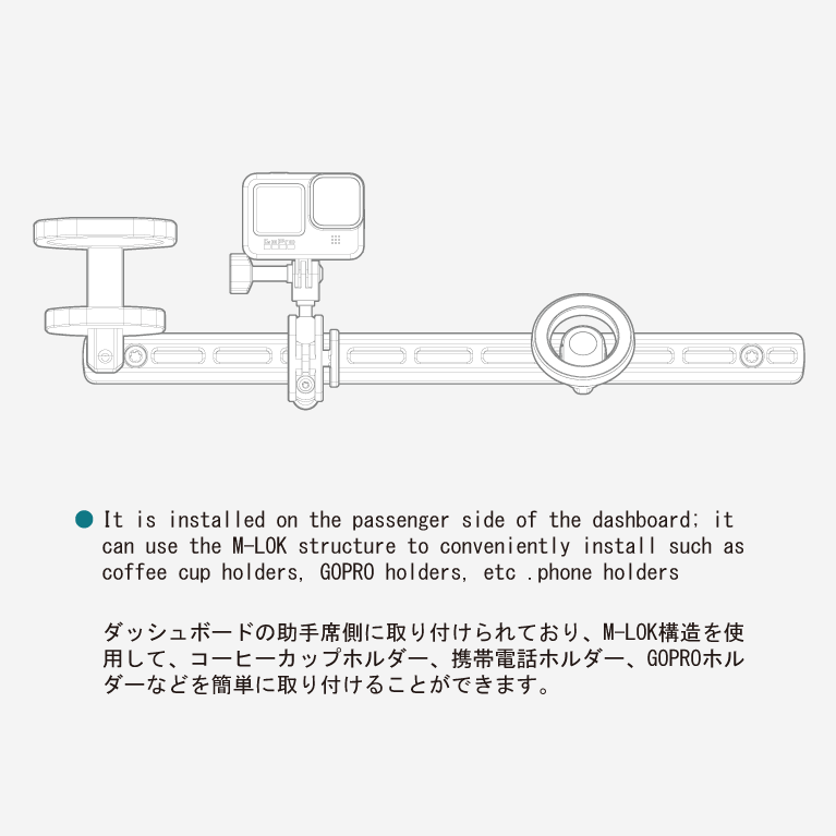 铃木ジムニー専用の M-LOK マウントシステムは、アルミニウム製の高品質アクセサリーです。運転席上部のアームレストに取り付け可能で、ドリンクホルダー、スマートフォンスタンド、フック、キーホルダー、GOPROマウントなど、様々なアイテムを装着できます。ドライブ中の利便性を向上させる理想的なアクセサリーです